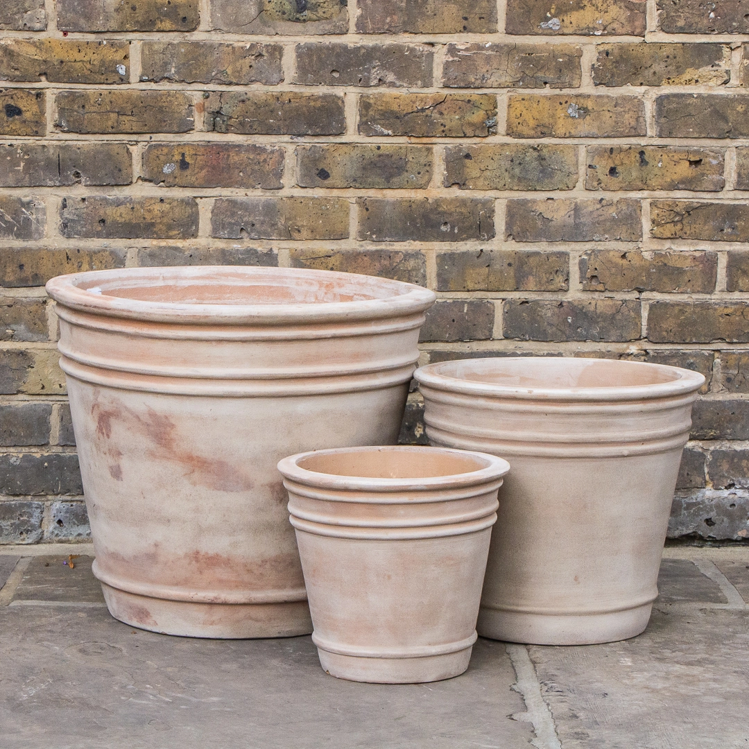 Elevate your garden setting with the Antique Sand Triple Rim Stone Planter, a striking terracotta plant pot that combines robust functionality with decorative flair. This planter is distinguished by its triple-rimmed design, which adds a sophisticated touch to the classic cylindrical shape. Perfect for cultivating small shrubs, perennials, and bedding plants, it accommodates various plant types with ease. The terracotta material is kiln-fired to ensure frost and UV resistance, making it suitable for all weather conditions. An extra-large drainage hole at the base enhances water management, crucial for healthy plant growth. Each planter is handmade, showcasing unique variations in finish and size that highlight its artisanal quality.
