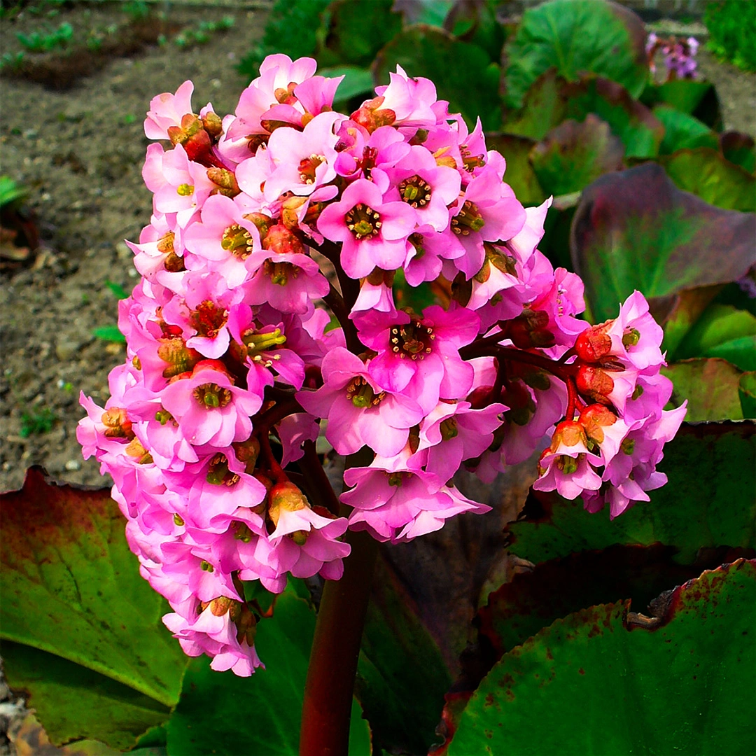 Bergenia 'Dark Damsel', commonly known as Elephant's Ears, is a striking perennial that adds a dramatic flair to any UK garden with its deep burgundy, almost black foliage. Supplied in a 3-litre pot, this evergreen plant is noted for its large, glossy leaves that turn even darker in colder months, providing year-round interest. In early to mid-spring, clusters of vibrant pink flowers emerge, creating a beautiful contrast against the dark leaves and attracting bees and butterflies to the garden. Perfect for borders, ground cover, or as an architectural plant in pots, 'Dark Damsel' is a versatile addition to both contemporary and traditional gardens. It pairs beautifully with silver-leaved plants like Artemisia or with golden foliage varieties for a striking colour contrast.