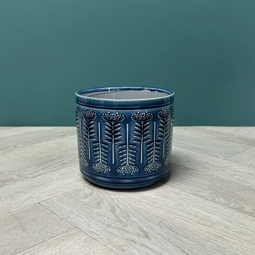 Elevate your home decor with the Blue Protea Pot, a beautifully crafted ceramic plant pot that combines practicality with artistic flair. This pot is available in two striking colours: a bold berry-red and a calm blue, each glazed with an ornate yet contemporary plant pattern in white embossed relief. The unique hand-painting process introduces subtle tones and colour drops, ensuring that no two pots are exactly alike and adding to their handmade charm.