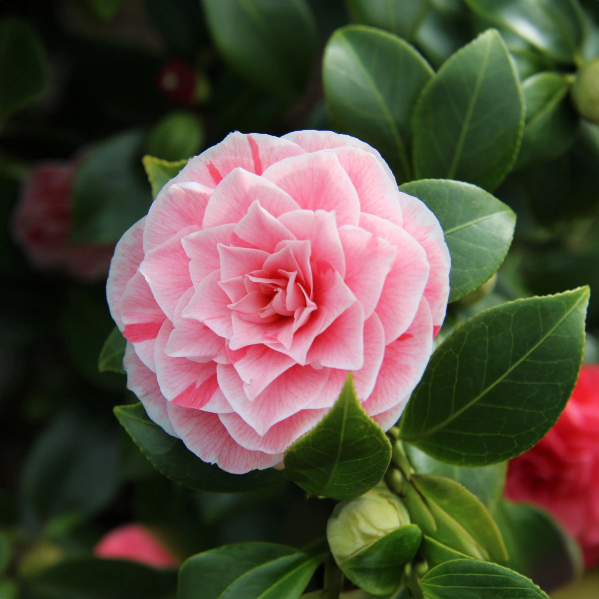 The Camellia 'Bonomiana' graces gardens with a timeless elegance and spectacular winter colour. Unfurling vibrant pink, peony-like blooms amidst a canvas of glossy dark green foliage, this evergreen shrub invites a classic, yet vibrant spectacle from winter to spring. Whether enhancing borders, fashioned into a statement hedge, or adorning patios in containers, 'Bonomiana' offers a captivating visual and a touch of timeless grace. Paired with early spring bulbs or contrasting foliage plants, it acts as a cornerstone of winter garden design, harmonizing beautifully with various garden styles and palettes.