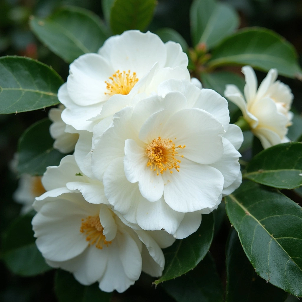 Camellia sasanqua ‘White’ is an outstanding evergreen shrub featuring stunning, semi-double white blooms from autumn through early winter. Each flower displays golden stamens, which contrast beautifully with its glossy, dark green leaves. This shrub has a compact and spreading habit, making it ideal for smaller gardens, containers, or as a feature plant in shaded borders. Its cold-hardy nature and ability to tolerate partial to full shade make it a reliable performer in various garden settings. Whether used in a woodland garden or as a low hedge, this Camellia brings elegance to any outdoor space during the colder months.