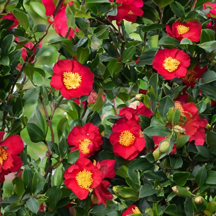 Camellia sasanqua ‘Yuletide’ is a beautiful evergreen shrub that stands out in the garden with its bright red single flowers and striking yellow stamens. Blooming from late autumn into winter, it provides a burst of colour during the cooler months when many other plants have finished flowering. Its glossy, dark green foliage makes an attractive backdrop year-round. This variety is relatively compact, making it suitable for small gardens, containers, or as a feature plant in borders. It thrives in partial shade and prefers acidic, well-drained soil. Yuletide is perfect for adding festive cheer to your garden during the winter season