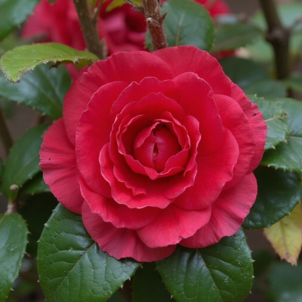 Camellia × williamsii ‘Les Jury’ is a stunning evergreen shrub, producing formal double, pillar box red flowers in early to mid-spring. These vibrant blooms, up to 10 cm wide, contrast beautifully with the dark green, glossy foliage, which emerges bronze before maturing to deep green. Its compact growth habit, reaching up to 1.5m in both height and spread, makes it an ideal choice for smaller gardens, containers, or as a feature in acid-soil borders. This award-winning Camellia (RHS Award of Garden Merit) is perfect for adding striking colour to shady garden corners or woodland settings, where it pairs wonderfully with other acid-loving plants such as rhododendrons, azaleas, or ferns.