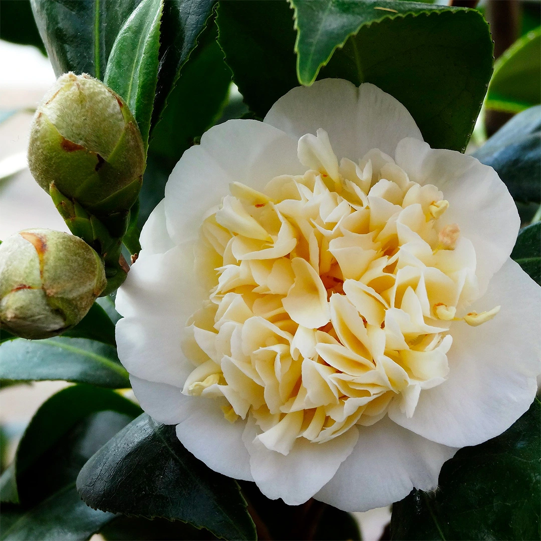 'Jurys Yellow' is an incredibly popular variety of Camellia with large showy flowers in an unusual golden yellow colour with a frilly centre. This variety of Camellia flowers in spring with an abundance of blooms.