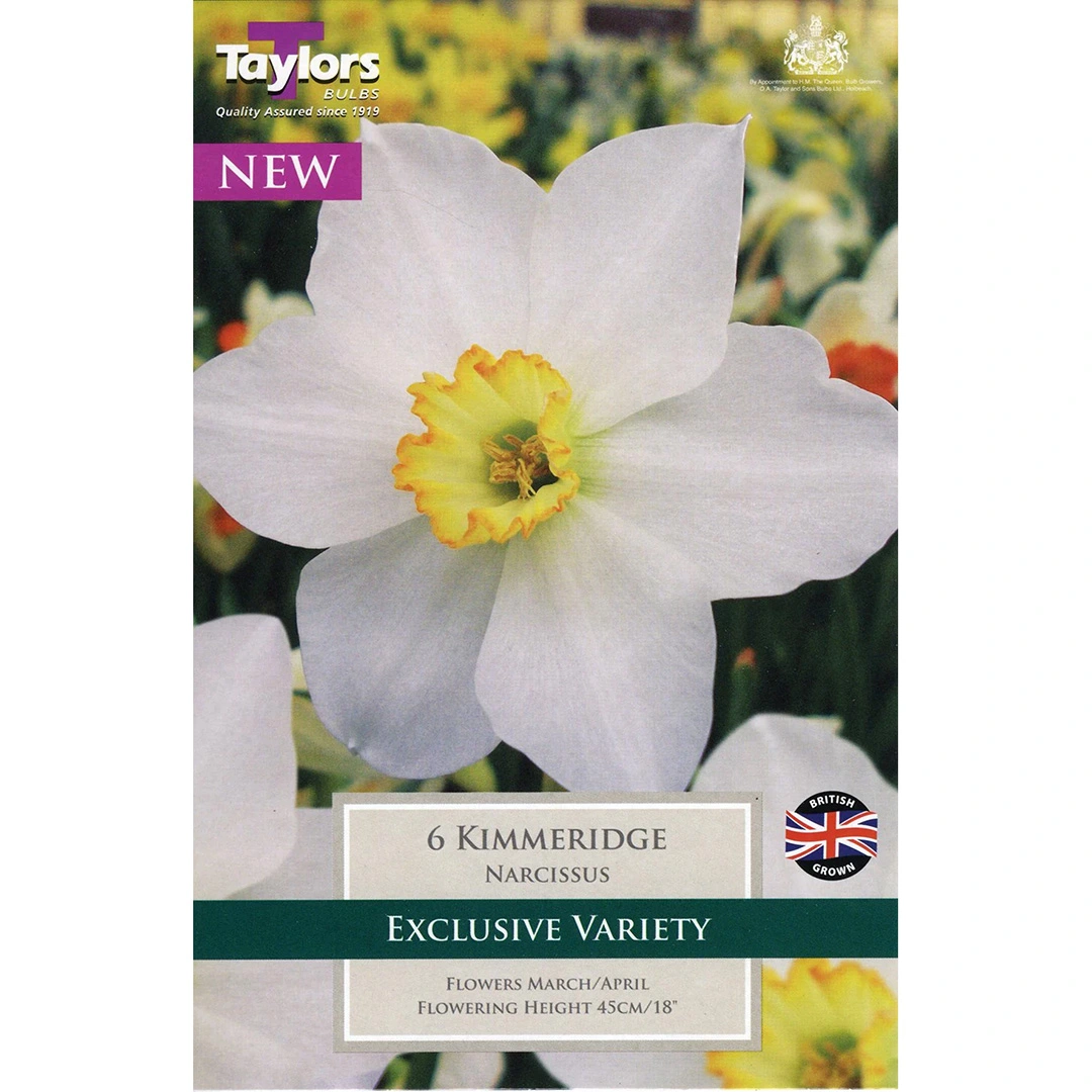 Narcissus ‘Kimmeridge’ is a beautiful and refined daffodil variety that brings a soft yet striking elegance to your spring garden. This daffodil features pure white petals that surround a smaller trumpet, which is a soft yellow with charming frilly orange edges. The delicate colour combination creates a sophisticated appearance, making ‘Kimmeridge’ an ideal choice for borders, beds, and containers. Blooming in mid to late spring, this variety pairs wonderfully with other spring bulbs such as muscari or white tulips to create a harmonious and elegant display. Hardy and well-suited to UK climates, ‘Kimmeridge’ is easy to grow and requires minimal maintenance, making it perfect for both novice and experienced gardeners. Its refined beauty and reliable performance make it a standout addition to any garden.