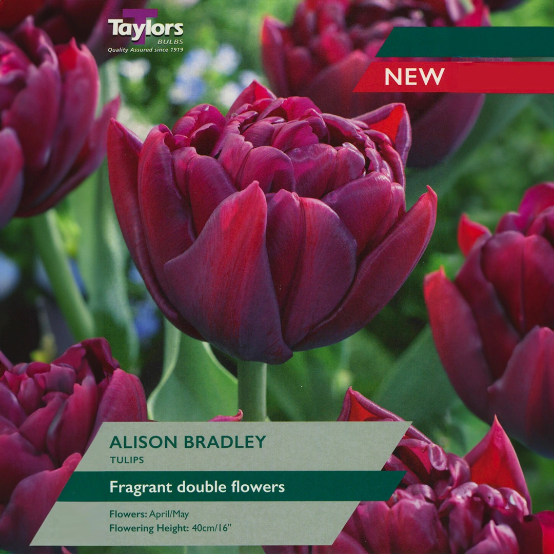 Indulge in the sumptuous beauty of Tulip 'Alison Bradley'. Radiating a rich, deep purplish-red hue, this recent introduction stands out with its full, peony-shaped blossoms. This tulip is not just a visual delight but a versatile addition to any garden. As a standalone, its vivid colour makes it an eye-catching centrepiece. When mixed with shades of cerise, maroon, and orange, and accented with a hint of blue, it creates a painterly garden tableau. For a dreamy spring display, plant it amidst forget-me-not seeds, producing a mesmerizing sea of blue foam that complements its deep red tones perfectly. Beyond the garden, its blossoms make for exquisite cut flowers, adding opulence to any floral arrangement.