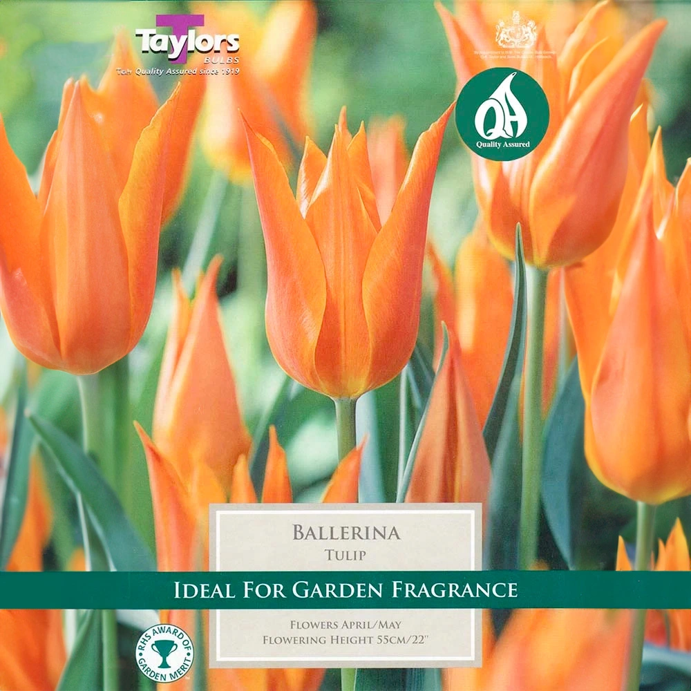 Its striking appearance, combined with a gentle, lily-like fragrance, ensures that it stands out amidst other spring flowers. Whether nestled within garden borders, potted in ornate containers, or presented in a bouquet, the 'Ballerina' tulip offers a touch of brilliance that is both captivating and enduring.
