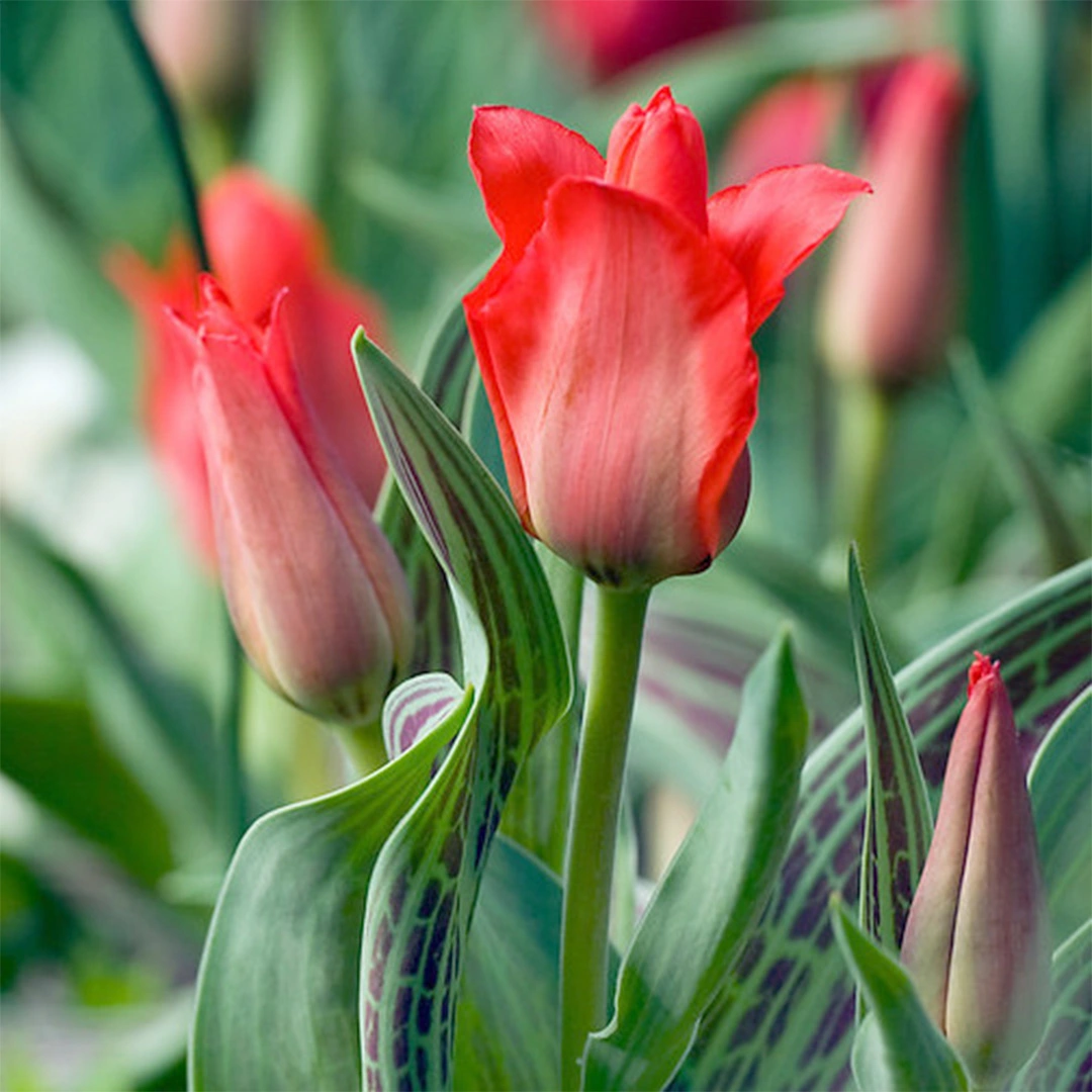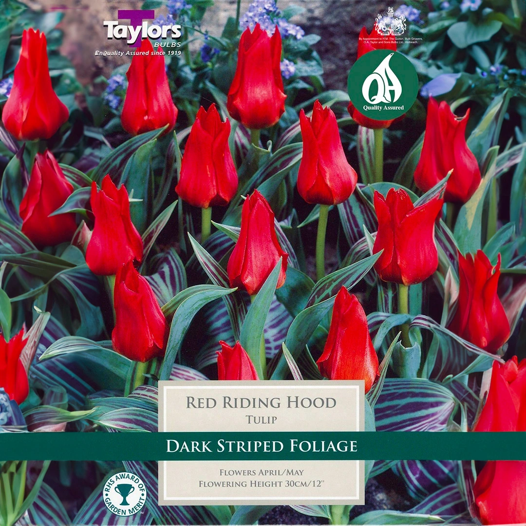 Tulip 'Red Riding Hood' promises to be a standout star in any spring garden with its dazzling, scarlet-red blooms. Not only do the vibrant petals of this tulip variety catch the eye, but its unique, green mottled foliage with streaks of maroon also adds an additional layer of interest. A compact and low-growing tulip, 'Red Riding Hood' is perfect for the front of borders, pots, or even as a vibrant carpet under taller plants. Its early to mid-spring bloom ensures your garden bursts into colour just when you're craving it most after the cold winter months.