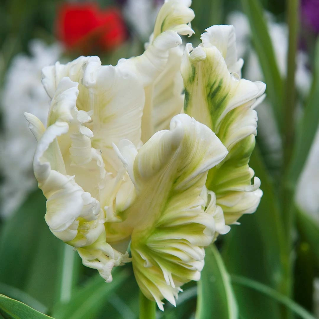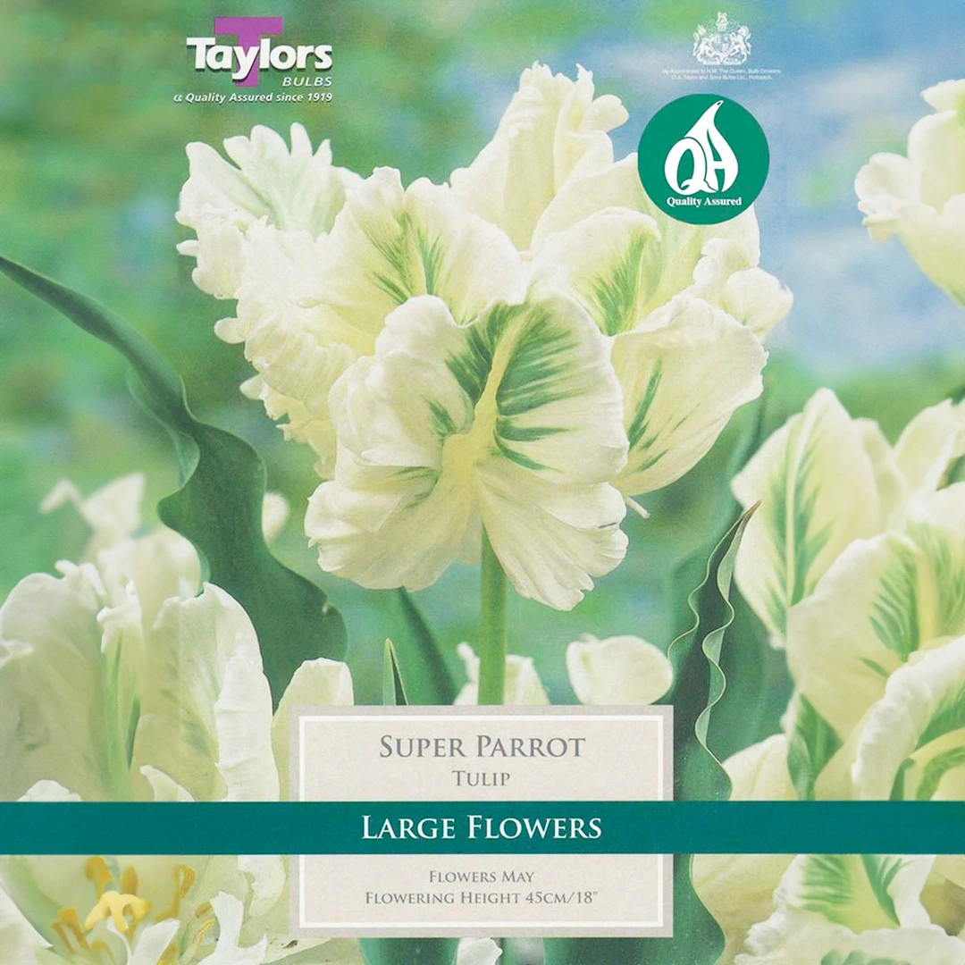 A masterpiece in every sense, the Tulip 'Super Parrot' is an embodiment of nature's spectacular artistry. With its radiant white flared heads, intricately feathered and adorned with strokes of green, it promises a mesmerising display come spring. Its petals, each uniquely twisted and turned, reveal an exquisite blend of white and green – a signature of the enchanting parrot tulip lineage.