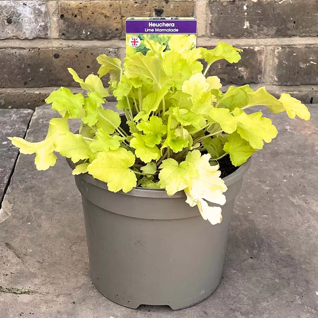 Heuchera ‘Lime Marmalade’ produces a striking clump of vibrant lime-green, heavily ruffled leaves that glow in shaded corners and containers alike. The foliage sits in a neat mound, typically topped in late spring by airy sprays of delicate creamy-white bell-shaped flowers on wiry stems. Ideal for brightening shady or semi-shaded garden borders, window boxes or patio containers, this coral bells cultivar adds year-round interest thanks to its evergreen/semi-evergreen habit. Pair it with darker foliage plants like heucheras in burgundy, hostas or ferny textures for contrast, or team with hardy geraniums and epimedium in woodland-style plantings. Its bold leaf colour means ‘Lime Marmalade’ works superbly as a feature in both mixed beds and patio planters where you need a splash of colour without relying solely on blooms.