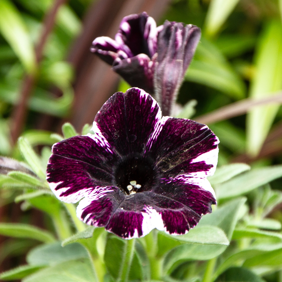 This Petunia has flower petals that are dark burgundy with a white edge.
