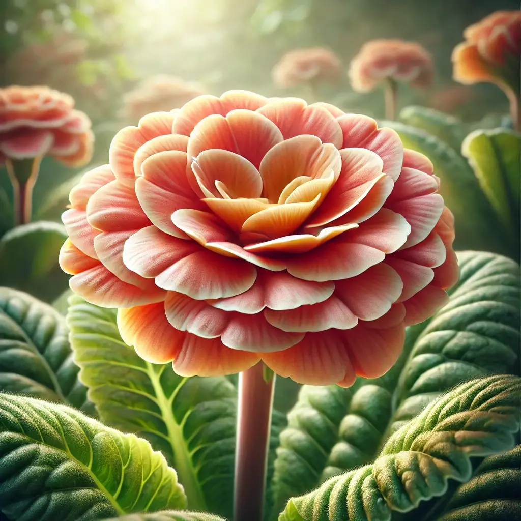 Primula ‘Rosebud Salmon Peach’ thrives in partial shade but can tolerate full sun if the soil remains consistently moist. It prefers well-drained, fertile soil enriched with organic matter. Water regularly during dry spells, especially in the growing season, to maintain soil moisture. Deadhead spent flowers to encourage continuous blooming and maintain plant vigor. An annual application of mulch in early spring can help retain soil moisture and suppress weeds. Generally pest and disease resistant, but watch for slugs and snails. In colder regions, protect from severe frost by applying a layer of mulch or relocating containers to a sheltered spot.