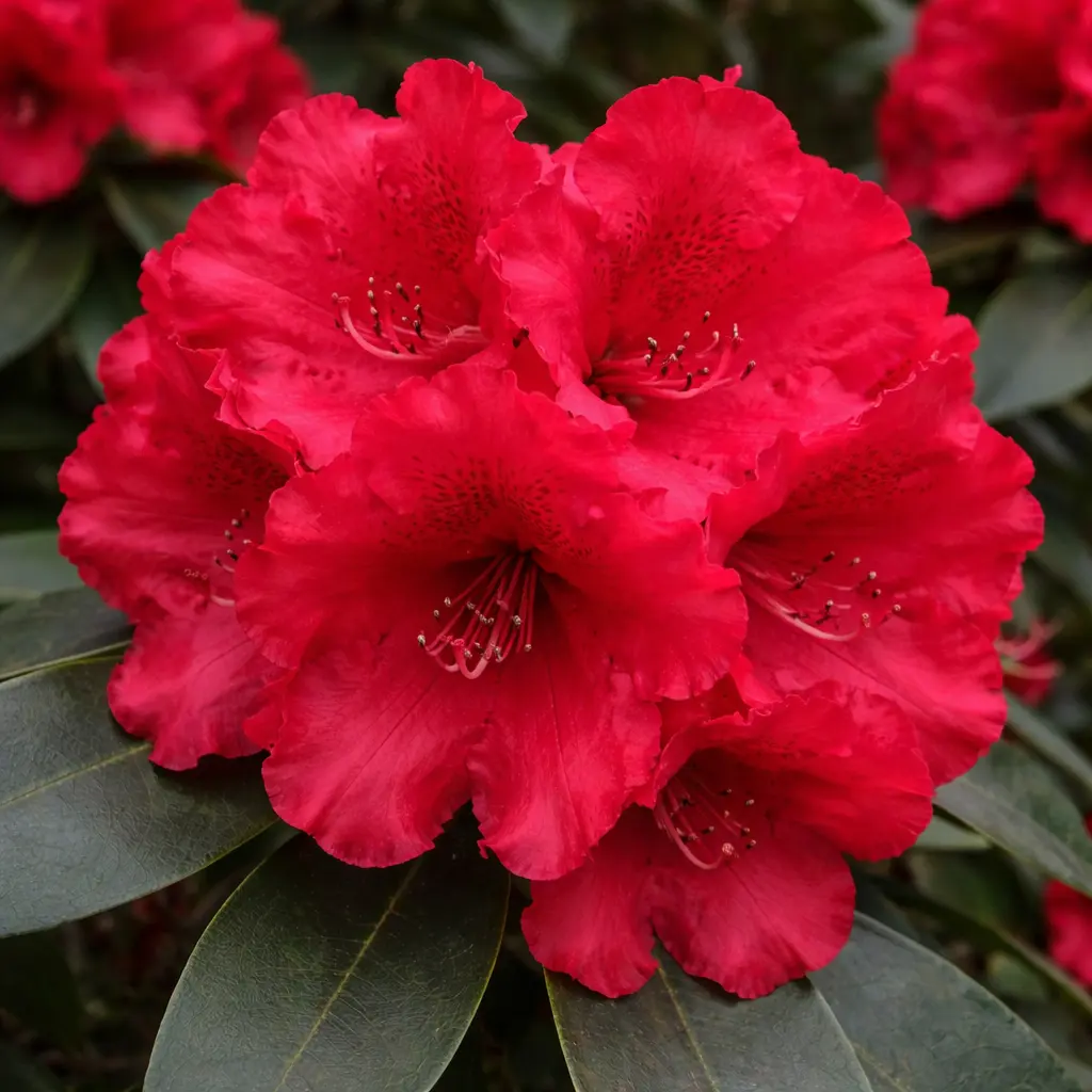 Rhododendron ‘Markeeta’s Prize’ is a bold and dramatic evergreen shrub celebrated for its rich, velvety red flower trusses in mid to late spring. Each large bloom carries subtle darker speckling in the throat, adding depth and texture to the intense colour. When in full flower, the rounded trusses create a vivid display that stands out beautifully against its leathery, dark green foliage.