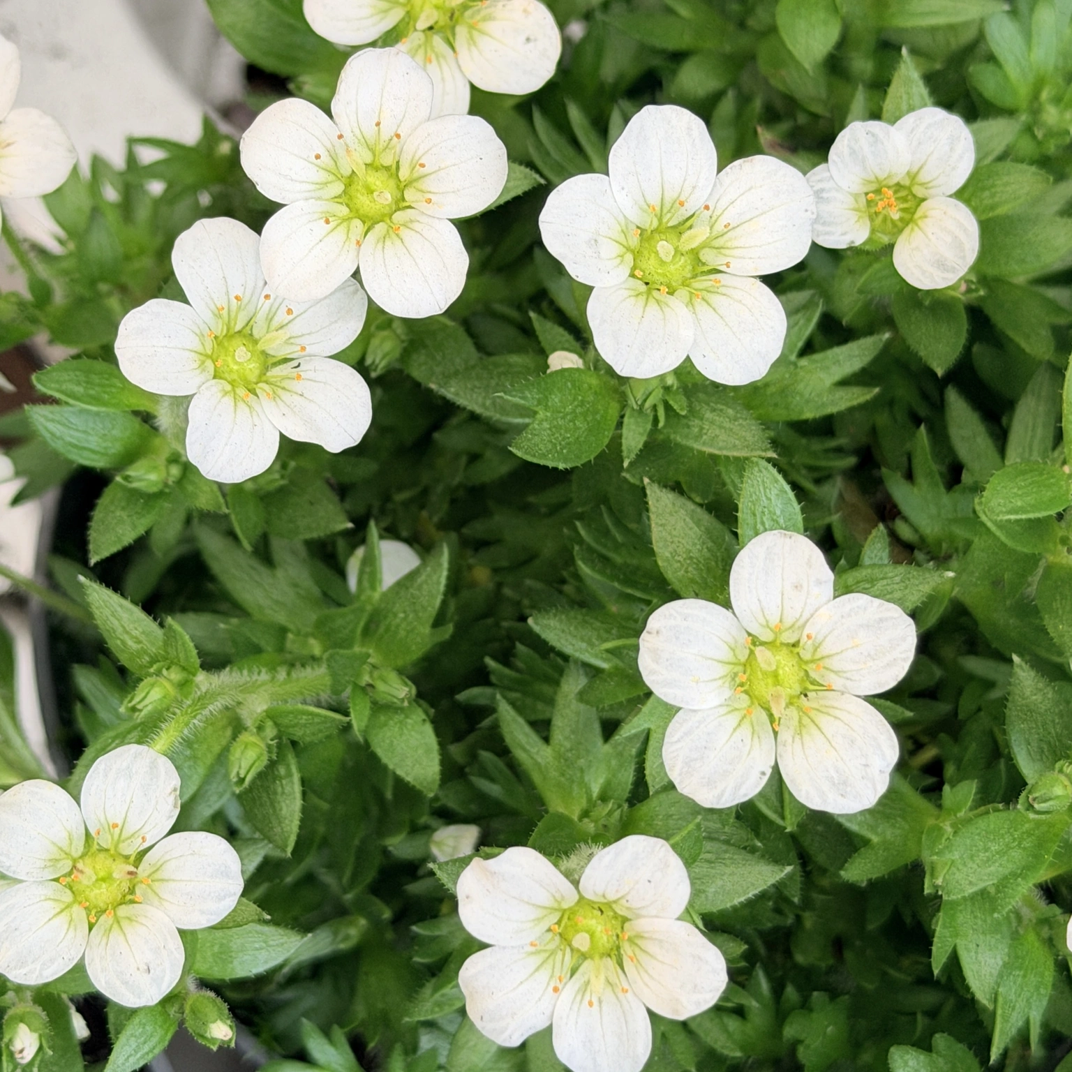 Saxifraga × arendsii ‘Saxony White’ is a compact, evergreen perennial valued for its neat cushions of fresh green foliage and masses of clean white flowers in spring. Each delicate bloom sits just above the foliage, creating a light, airy display that brightens rockeries, gravel gardens, alpine troughs and the front of borders.