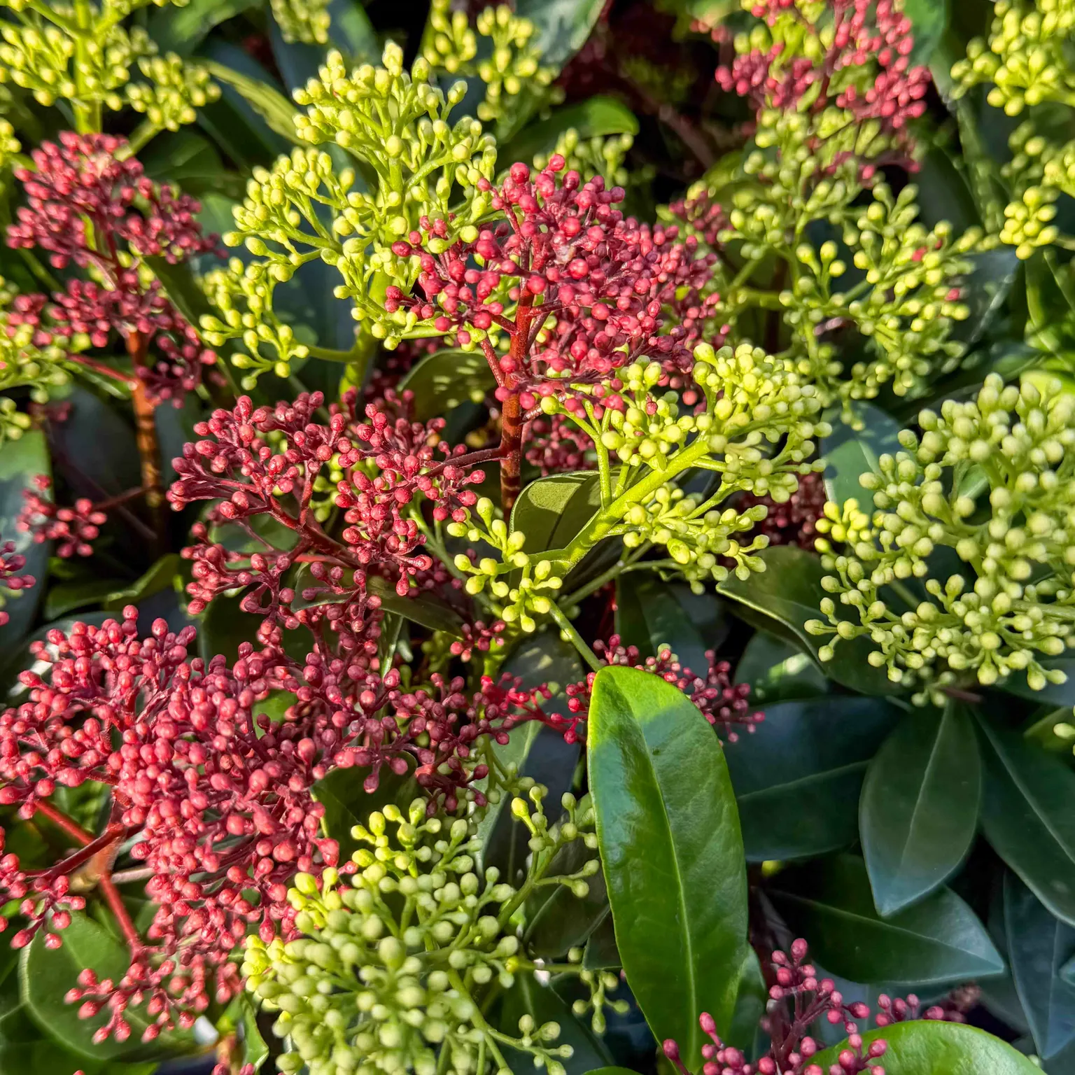 Plant in fertile, moist but well-drained, humus-rich soil. Skimmias prefer partial to full shade, as strong sunlight can scorch the foliage. Keep well watered during dry spells, particularly in the first year or when grown in containers. Mulch with leaf mould or composted bark annually to conserve moisture and maintain the soil’s acidity. Skimmias are slow growing and need little pruning — simply trim lightly after flowering if required and remove damaged shoots. Feed container plants with an ericaceous fertiliser from spring to late summer for best results.