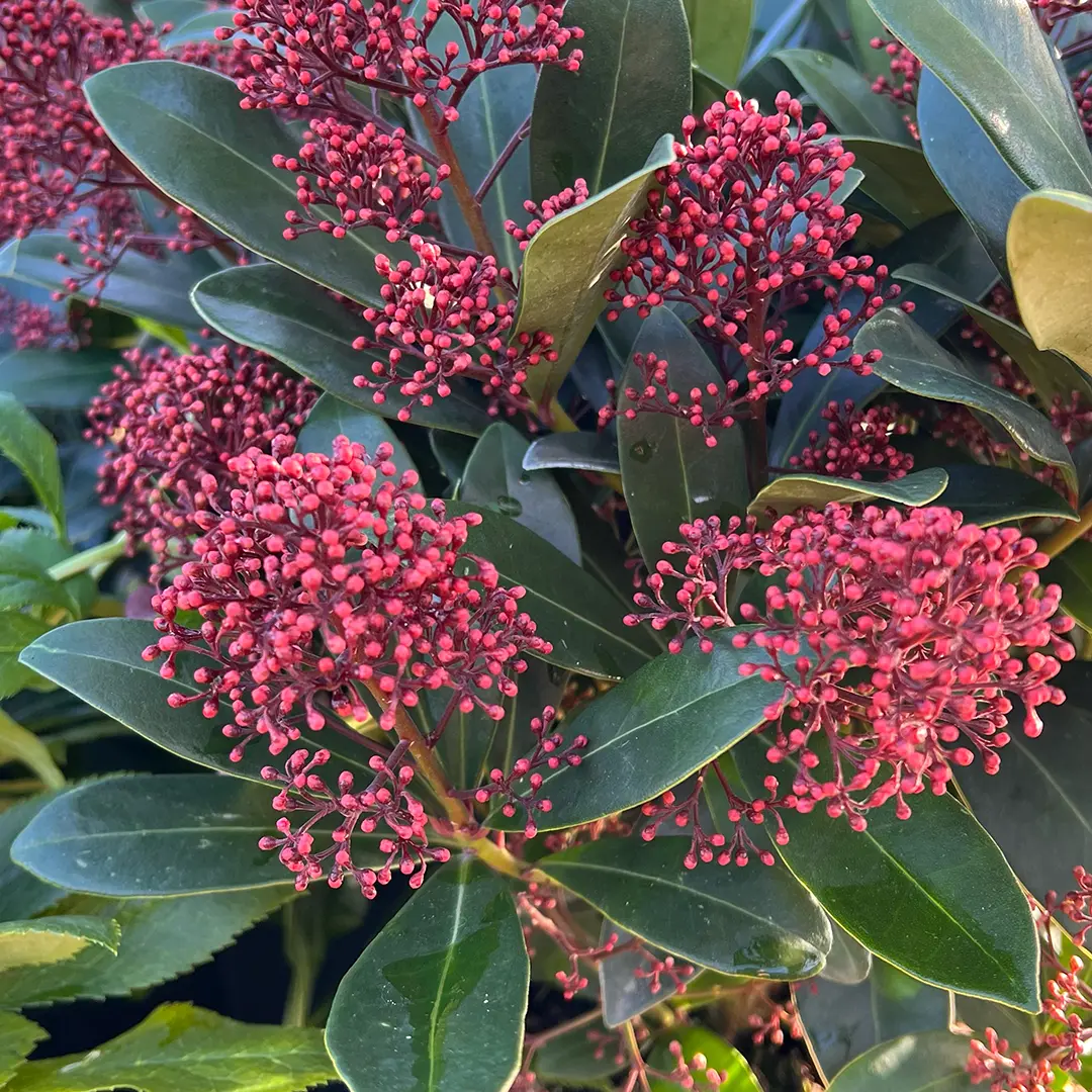Allow your garden to bask in the enduring charm of the Skimmia japonica 'Red Dwarf', a delightfully compact evergreen shrub that infuses year-round visual and aromatic allure into any space. With its petite stature and glossy, dark green leaves, it's perfectly suited for smaller gardens, pots, and even balcony containers. Come spring, revel in the delicate, sweet perfume of its tiny blossoms, an olfactory pleasure that breathes life into any outdoor area. As autumn greets, clusters of lustrous red berries elegantly adorn the foliage, persisting through winter and offering a festive touch. Nestle it amidst ferns or heathers to create a luscious, textured landscape, or pair with vibrant cyclamen for a burst of contrasting colour, ensuring a garden that tantalises the senses throughout the seasons.