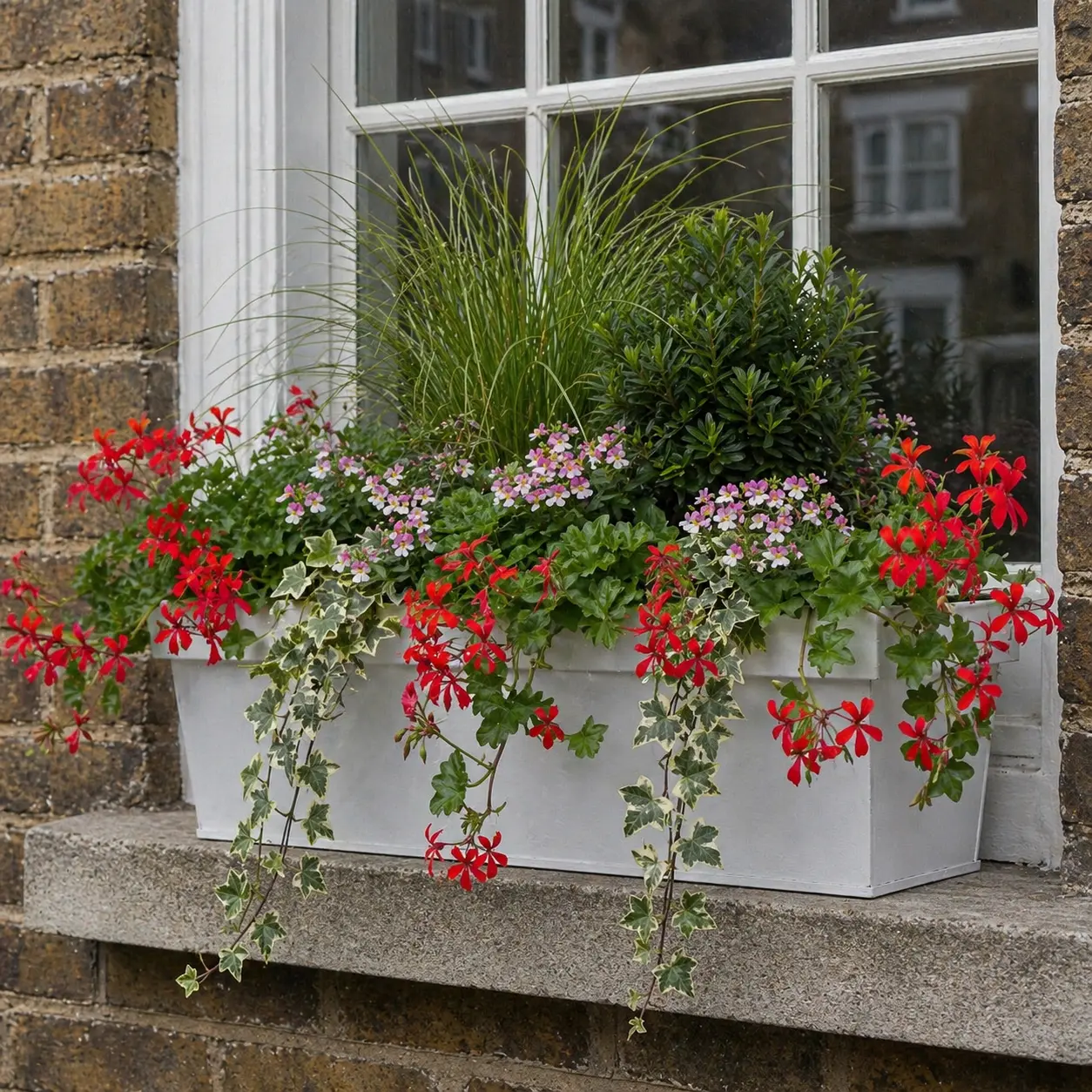 The result is a sophisticated, easy-to-place window box that works beautifully on London windowsills—offering a layered, professional look that feels both abundant and considered.