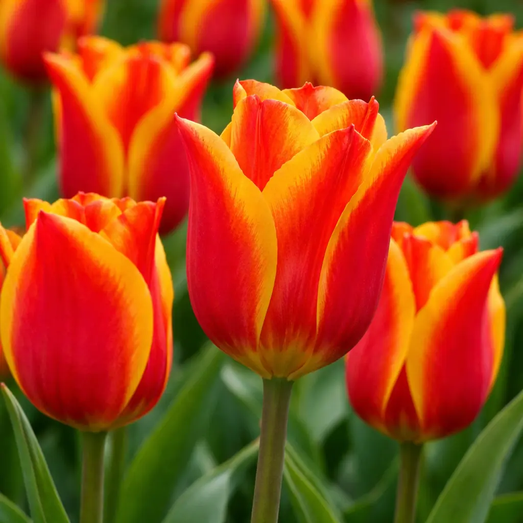Tulip ‘Cape Cod’ is a striking, high-impact tulip celebrated for its dramatic bi-colour flowers. Each bloom combines rich scarlet-red petals edged and flamed with golden yellow, creating a fiery, uplifting display that instantly draws the eye in spring.