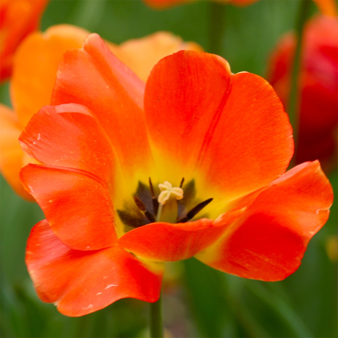 Create a sea of luminous orange blooms that shine out when underplanted with blue smaller flowering bulbs such as Chionodoxa or Muscari