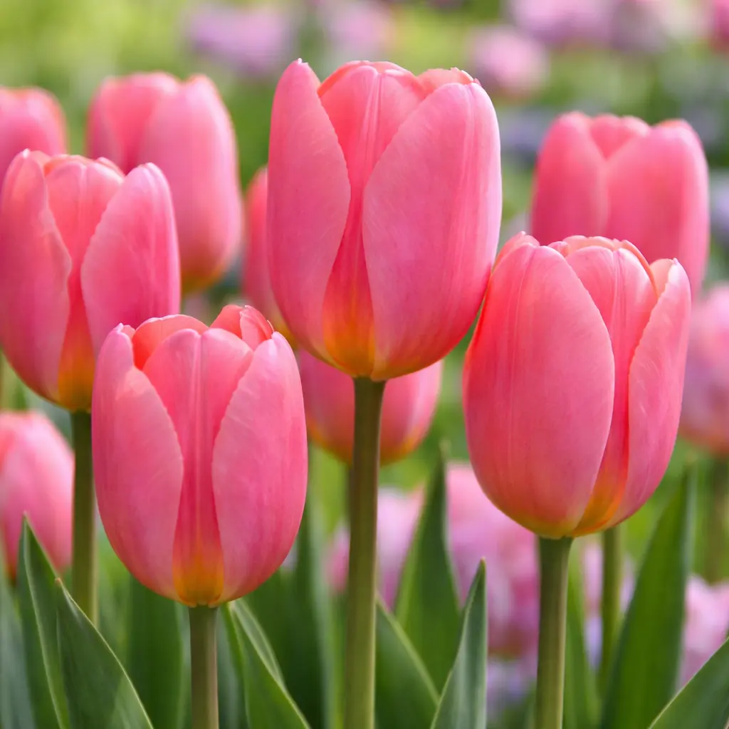 Tulipa ‘Menton’ is a much-loved Darwin Hybrid tulip, valued for its graceful stature and beautifully nuanced colouring. The large blooms open in warm salmon-pink tones, gently flushed with apricot and peach, creating a soft, luminous effect that changes with light and temperature. The flowers are held on tall, sturdy stems above broad, fresh green foliage, giving the plant a poised, architectural presenceIn containers, ‘Menton’ makes an elegant focal point, particularly in larger pots where its height and flower size can be fully appreciated. It pairs effortlessly with muted spring companions such as pale narcissi, cream or blush tulips, blue muscari, and early perennials, creating calm, layered displays. In borders, it brings height and softness, bridging the transition between early spring bulbs and emerging summer planting.